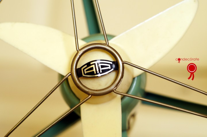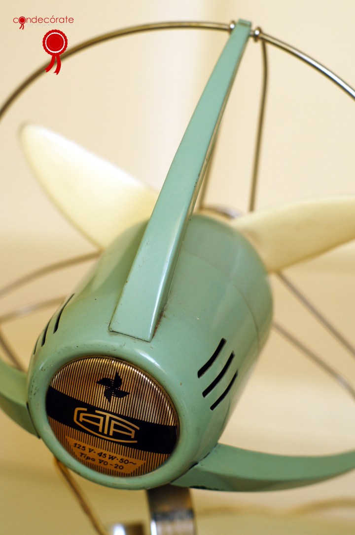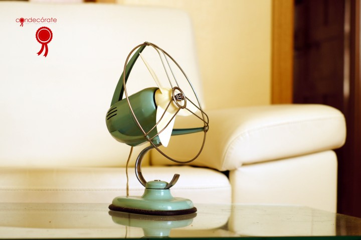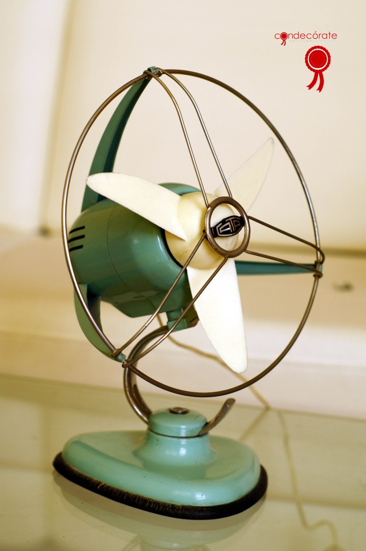 En Condecórate tenemos una extensa colección de ventiladores domésticos y, sin lugar a duda, éste es nuestro favorito. Está construido en hierro lacado azul turquesa, color alegre muy común en la época.