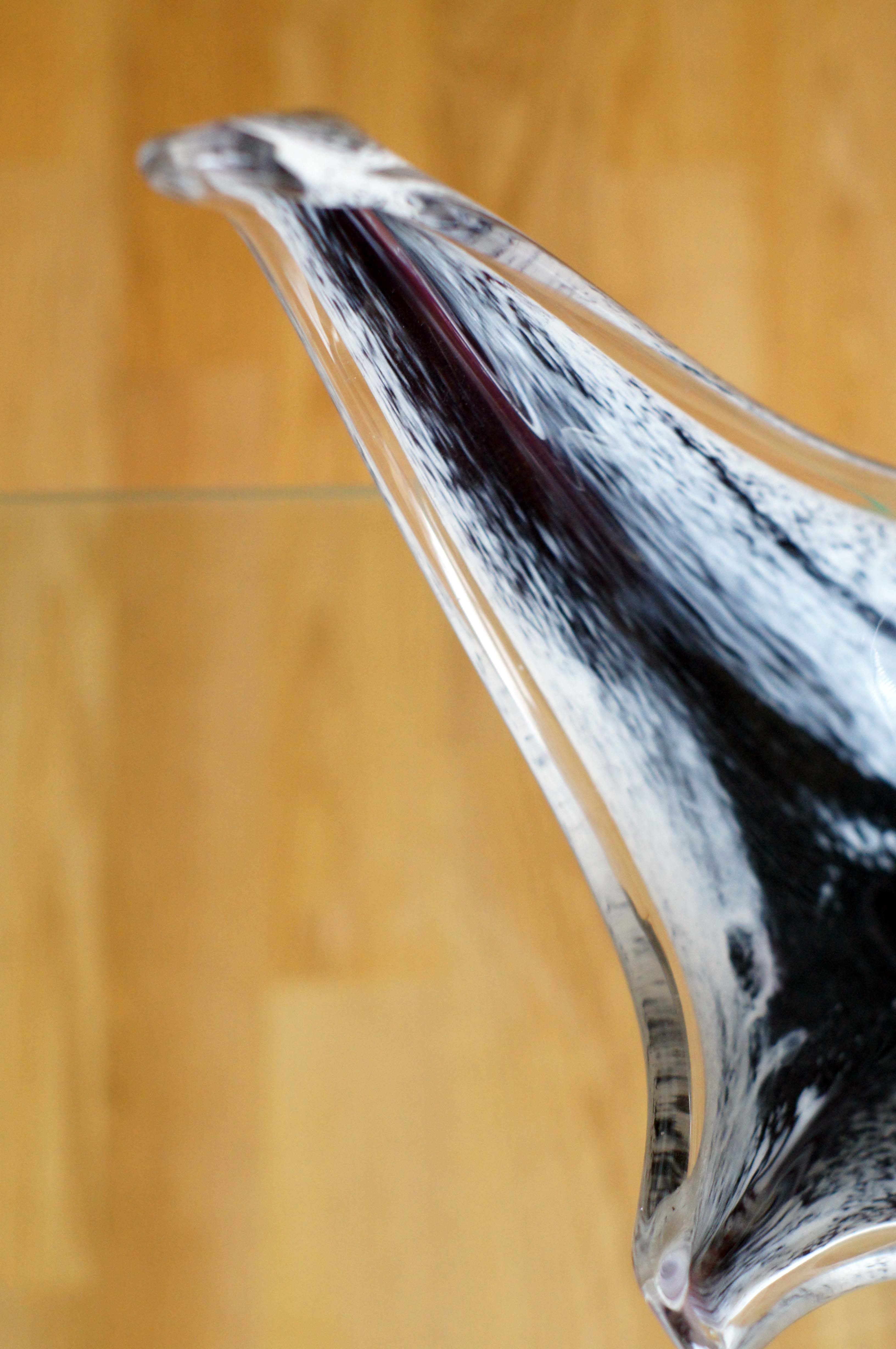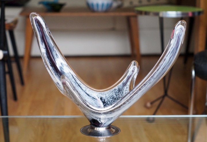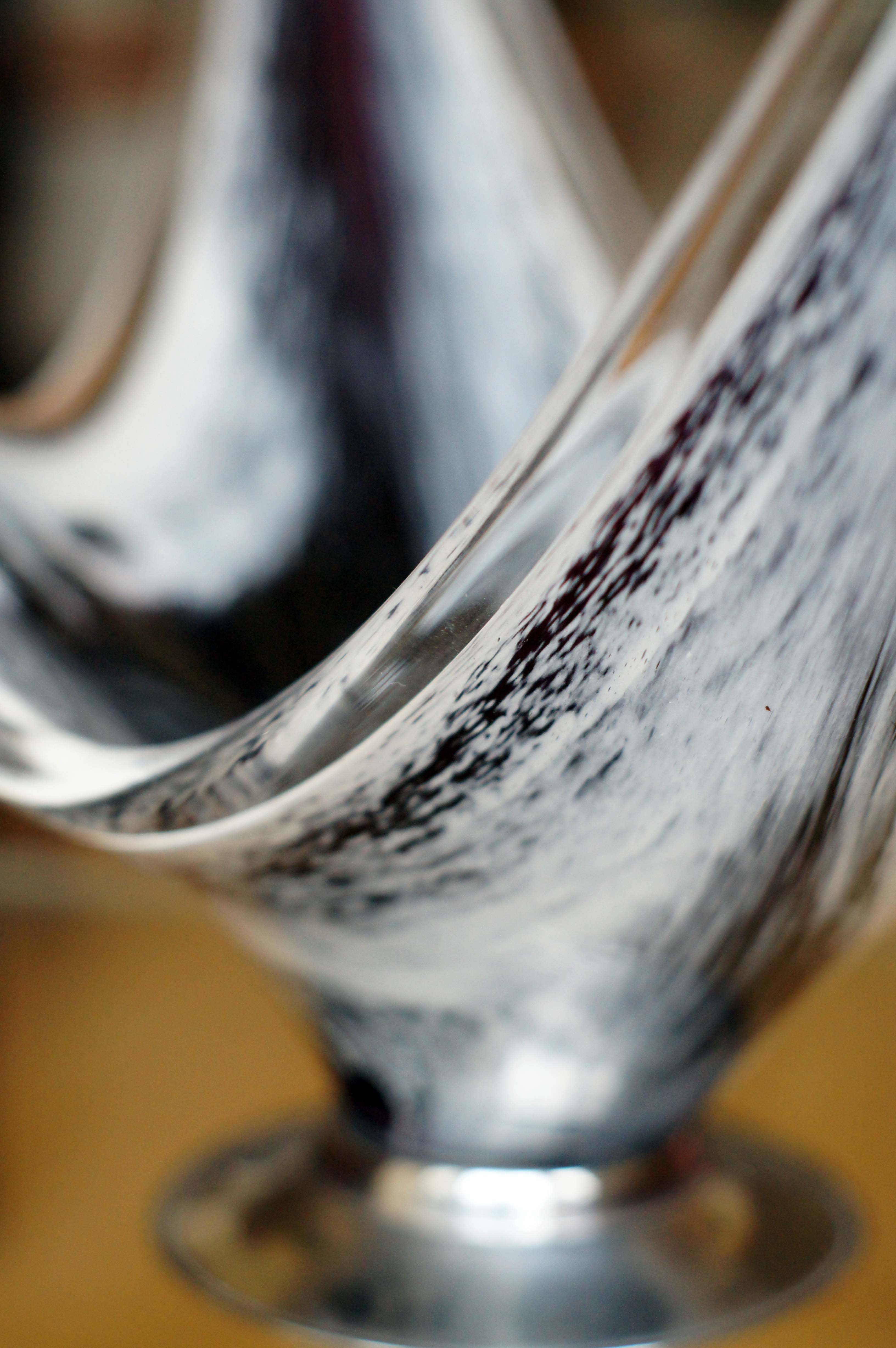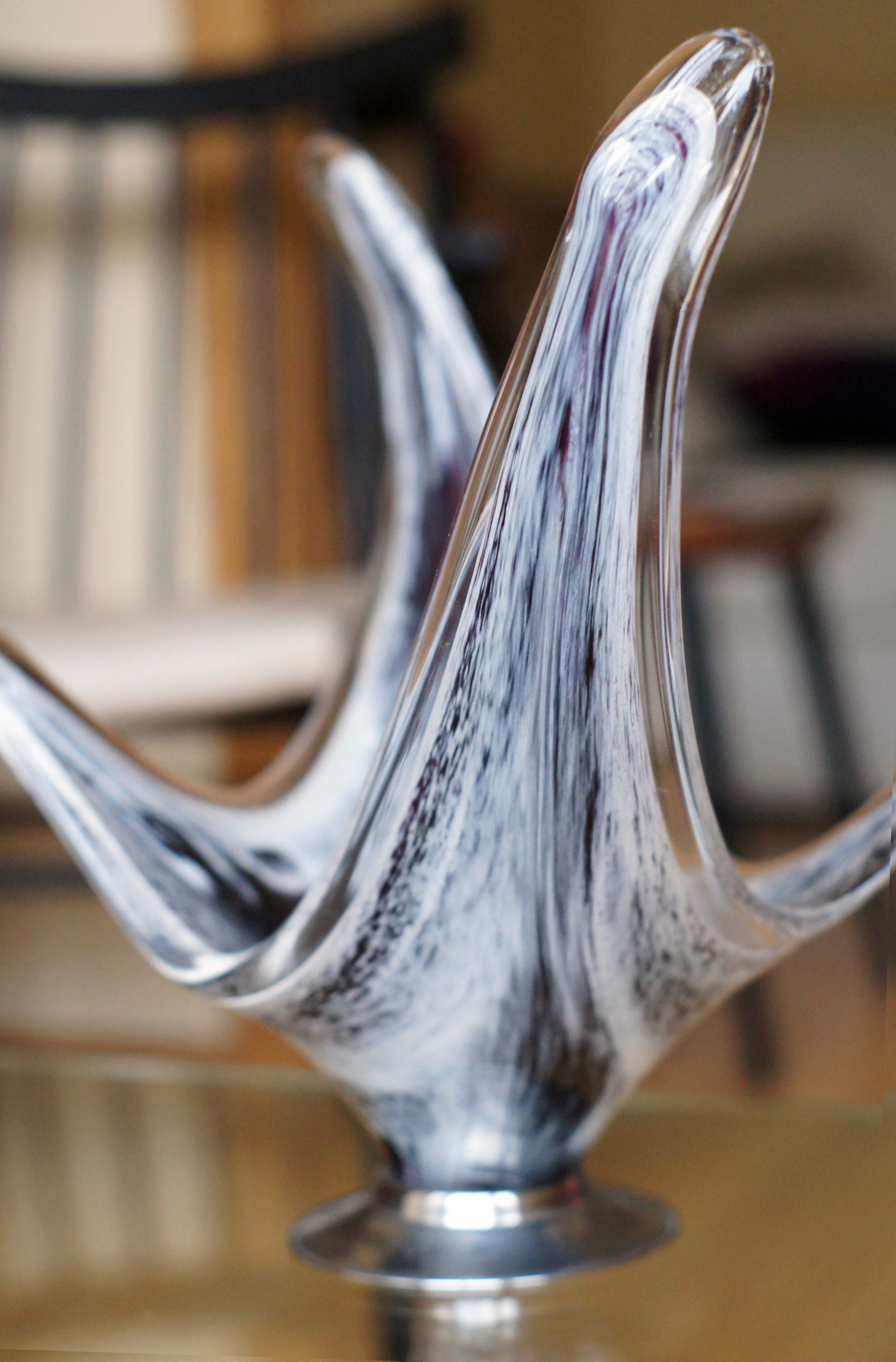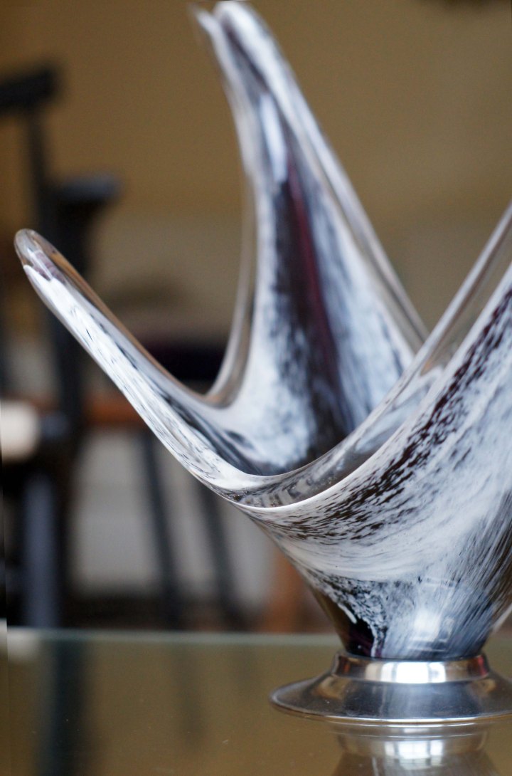 Precioso centro de cristal con base cromada de grandes dimensiones. Tiene tonalidades blancas, y violetas. El tinte violeta ha desaparecido por ser muy tóxico para el artesano en el proceso de elaboración del vidrio soplado.