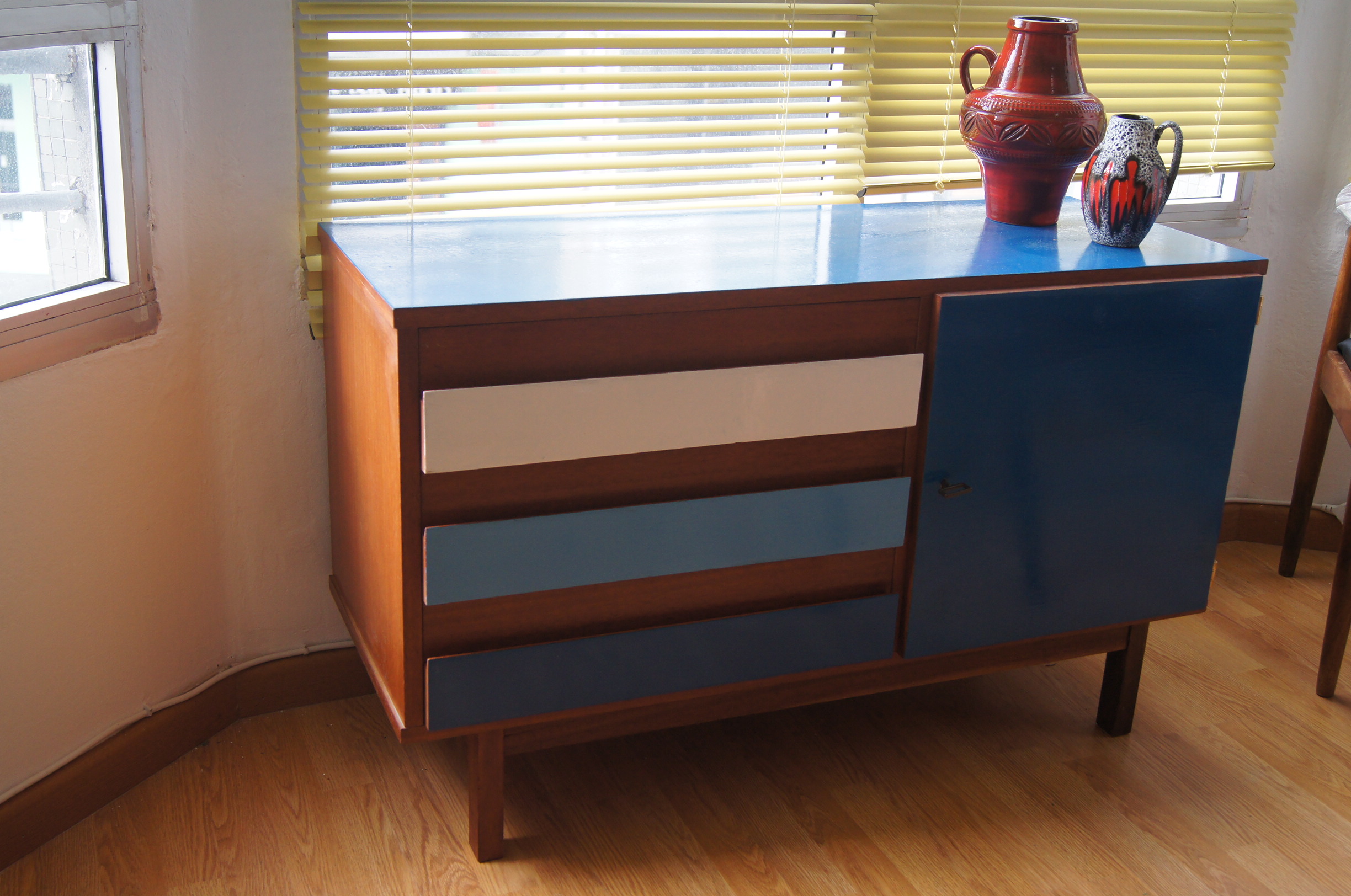 Está disponible en condecórate este aparador con tres cajones y una puerta lateral de los años 60.
