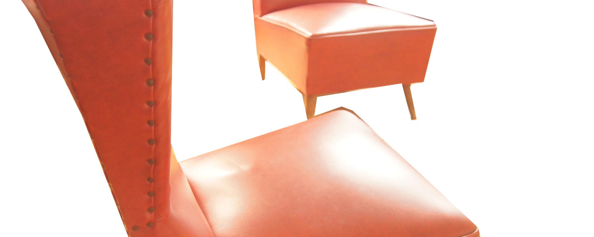 Butacas originales de los años 50 con tapizado en eskai de color rojo inglés y patas bambi de madera de castaño, al igual que la estructura.