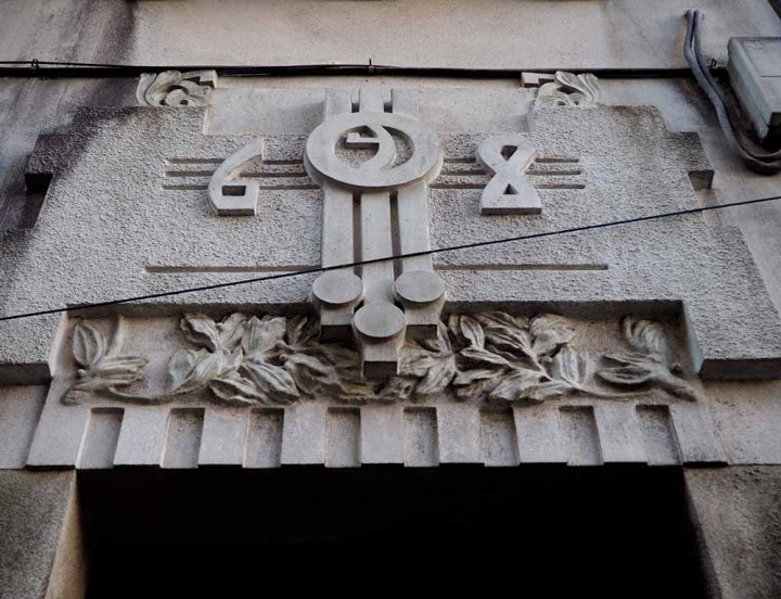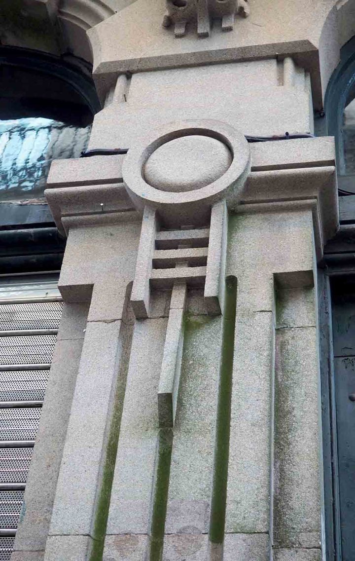 El estilo modernista se manifiesta en las últimas plantas con ornamentos geométricos. Franjas verticales y círculos, junto con una peineta de remata escalonada que recuerda al modernismo vienés. A pie de calle resultan difícil de detectar sus líneas modernistas por lo que es preciso detenerse a observarlo puesto que su arquitectura no es tan evidente como en otras obras.