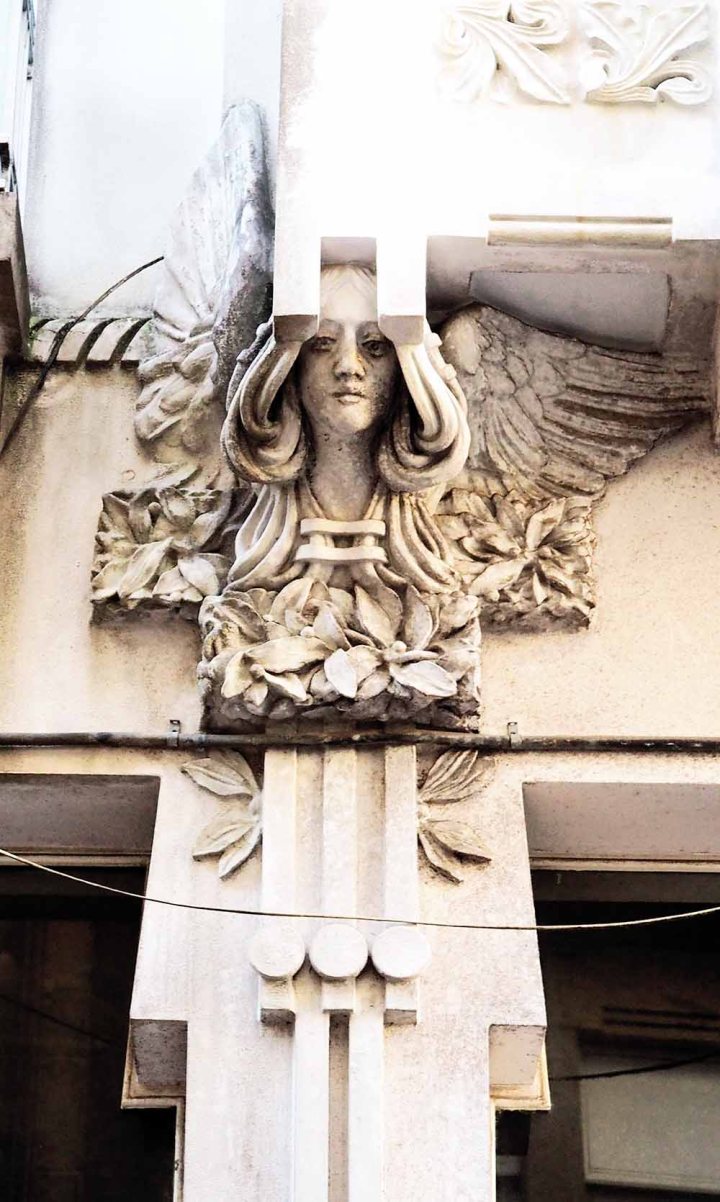 Los laterales de la fachada se remarcan con verticales formas modernistas que enmarcan las esculturas femeninas situadas a ambos lados. Dichas representaciones, recuerdan a las cariátides griegas, figuras femeninas esculpidas con función de columna o pilastra que sostenían un entablamento sobre su cabeza.