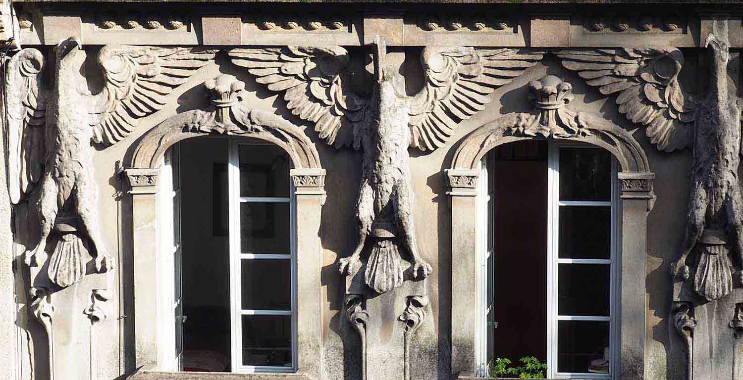 Sin duda lo que más destaca de su fachada es su maravilloso arco oval, cuyas esculturas se inspiran en los Atlantes de la Antigüedad (figuras masculinas que sostienen al igual que las cariátides una cornisa o entablamento y que provienen del mito de Altante —titán griego condenado por el dios Zeus a cargar el cielo sobre sus hombros —)