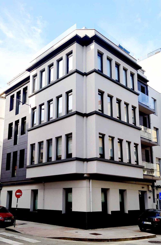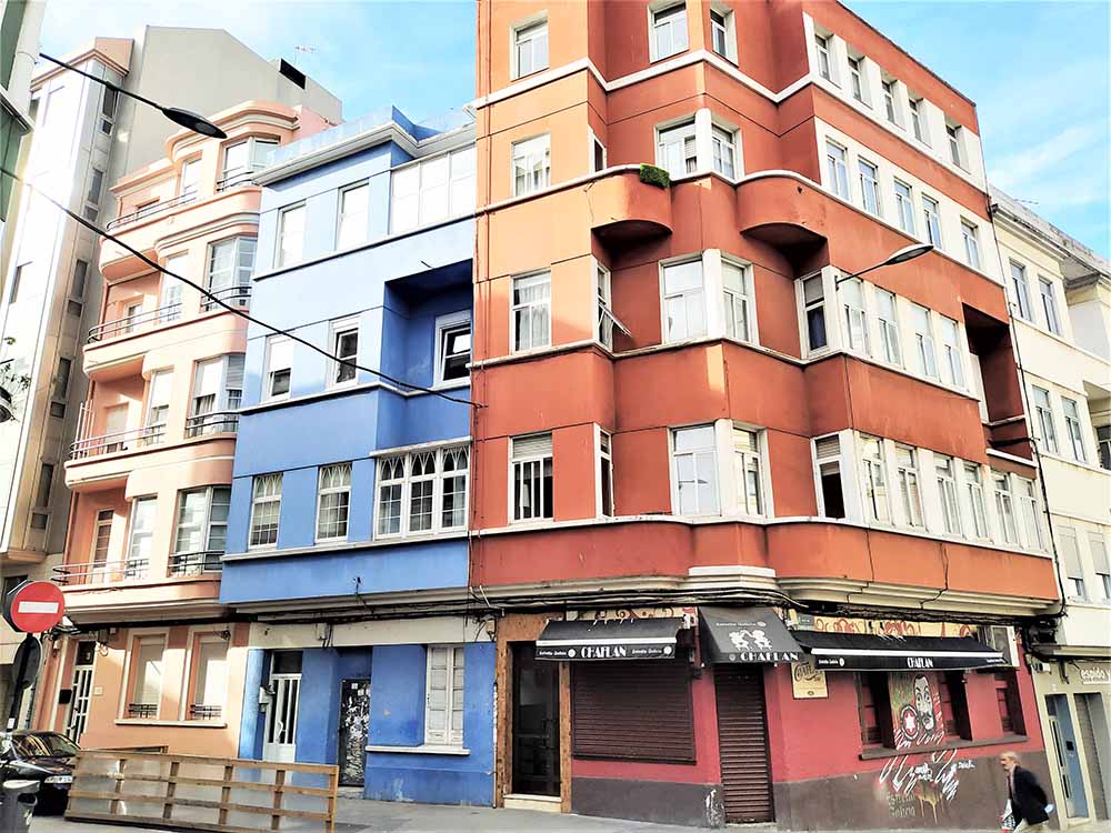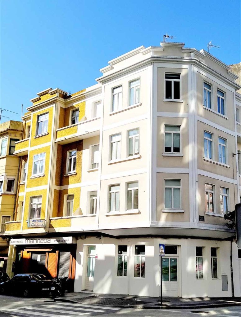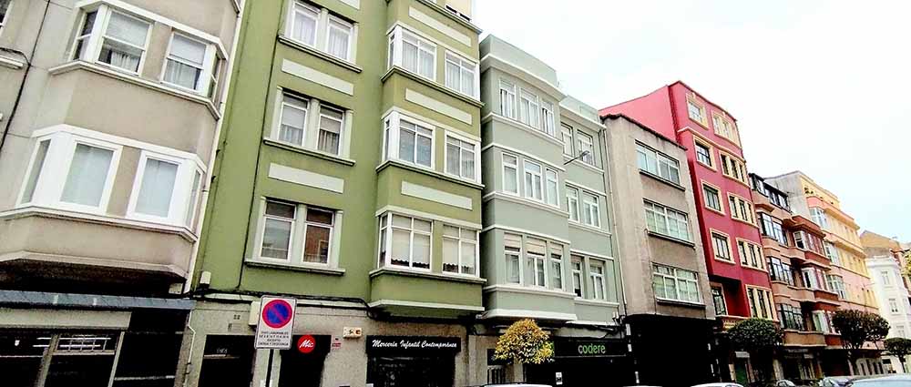 El siguiente edificio, situado en el mismo entorno, haciendo esquina en la calle Cronista Pacheco con la calle Mariscal Pardo de Cela, también ha sido rehabilitado con éxito. En este caso, en la fachada se han potenciado las cornisas escalonadas entre las distintas alturas introduciendo un acento de color.