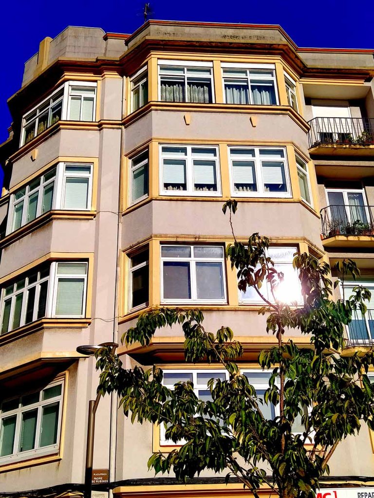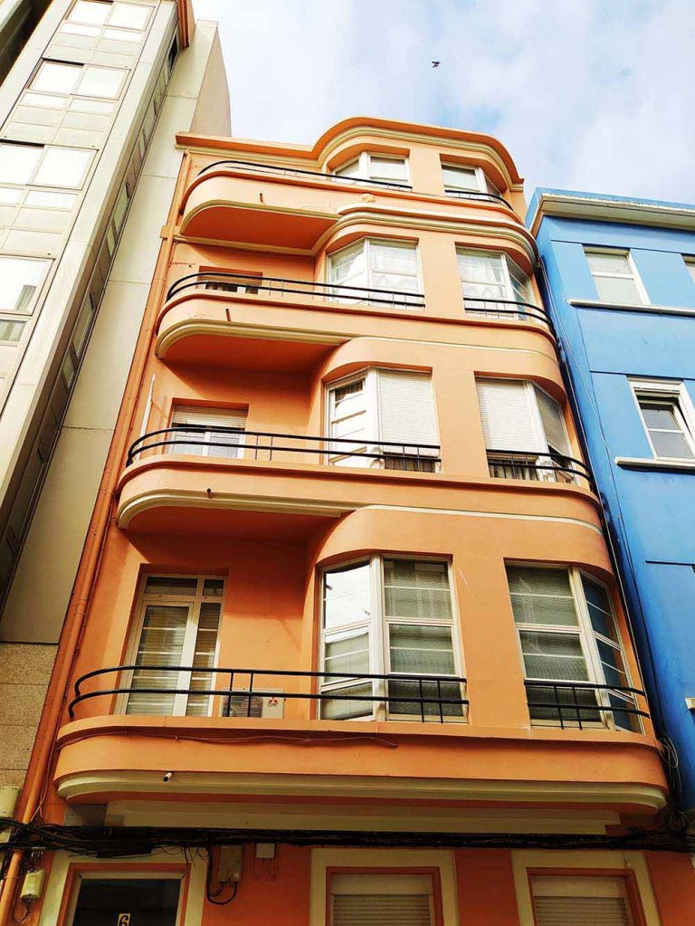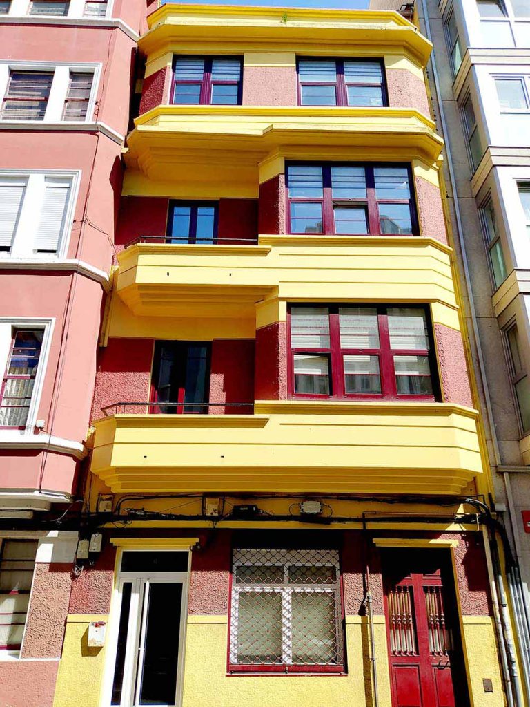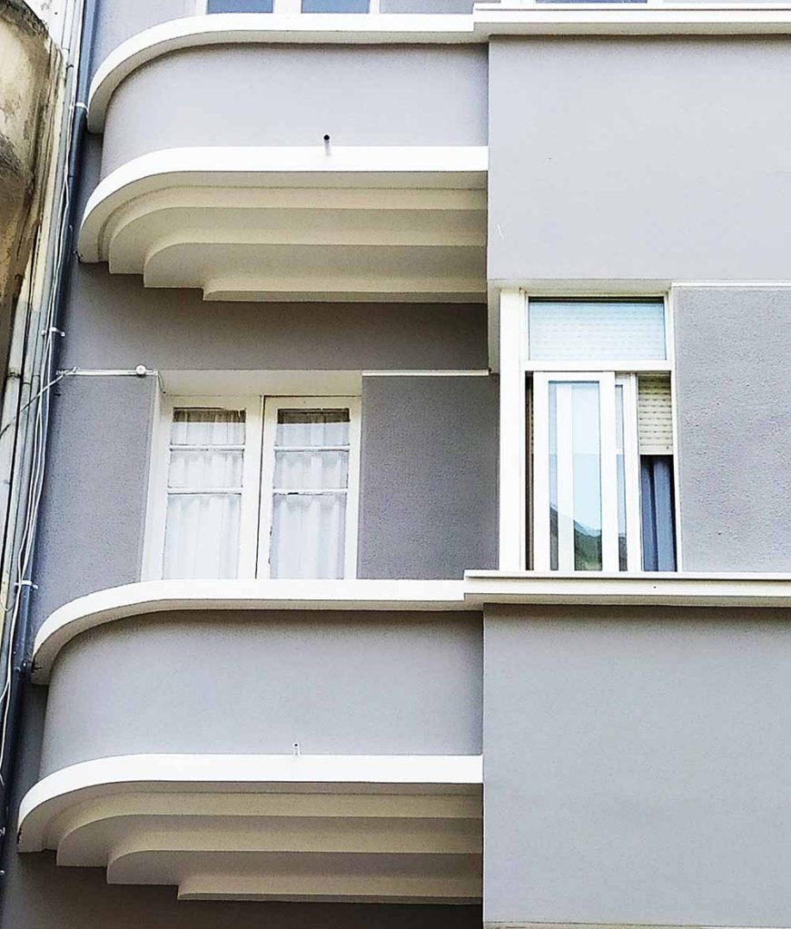 En otro ejemplo de racionalismo coruñés de la zona de Os Mallos, apreciamos que esta fachada está esgrafiada con acanaladuras horizontales como recurso decorativo racionalista decó, a la par que enfatizan el movimiento geométrico de la fachada.