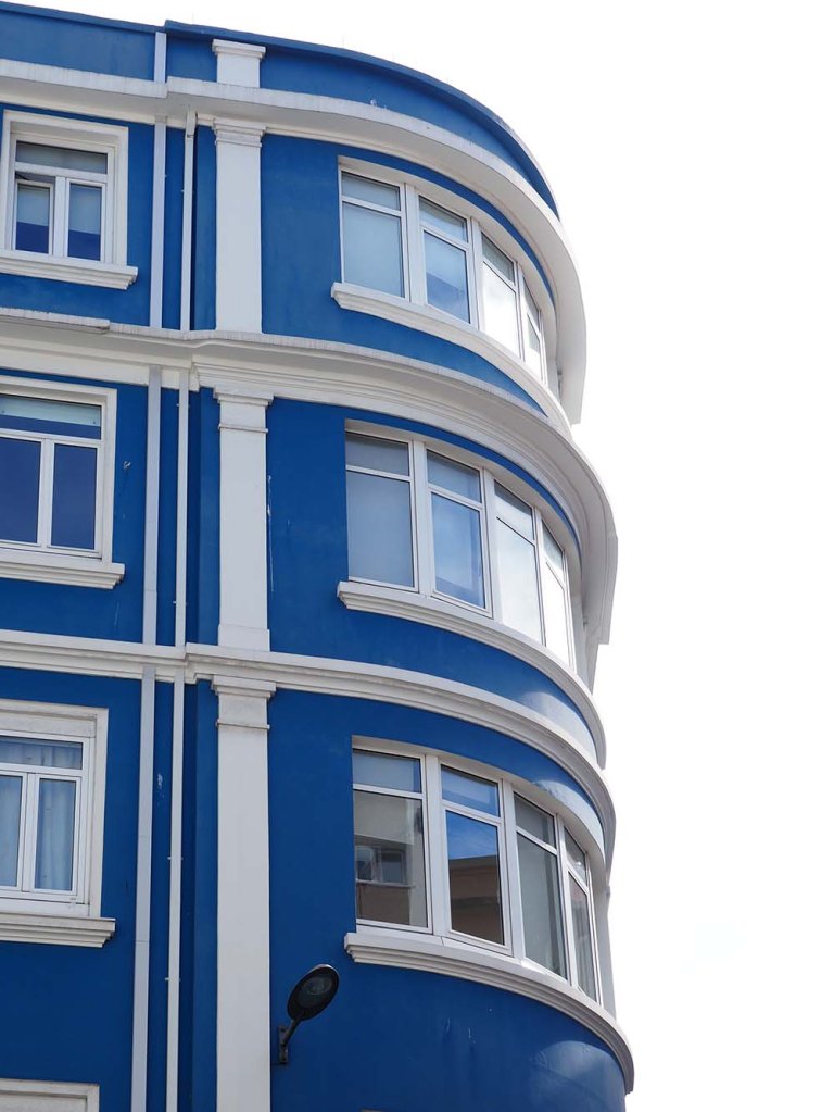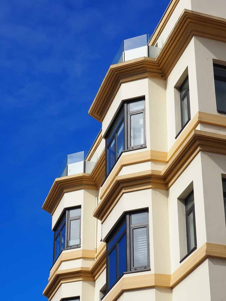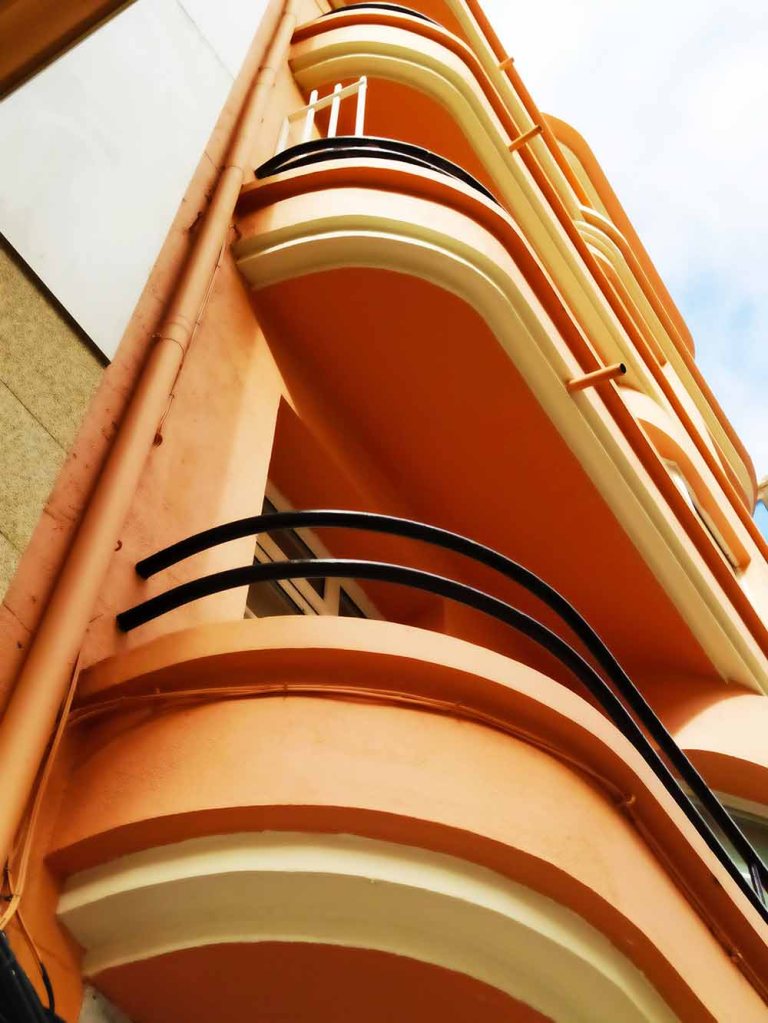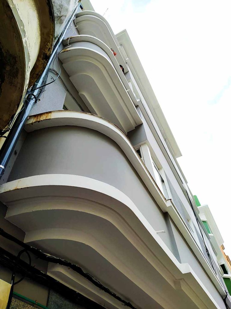 Destaca por sus líneas orgánicas curvas que se aprecian en todos los voladizos, resueltos con barandilla en forja de líneas simples, balcones curvos racionalistas y galerías art decó.