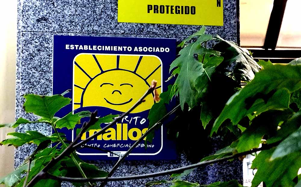 En A Coruña solo existen dos centros comerciales abiertos: Os Mallos y zona Obelisco. En Os Mallos, los locales comerciales se identifican con el distintivo de la Asociación de Comerciantes Distrito Mallos, un entrañable sol dibujado a mano por un niño, según cuentan en su página oficial.