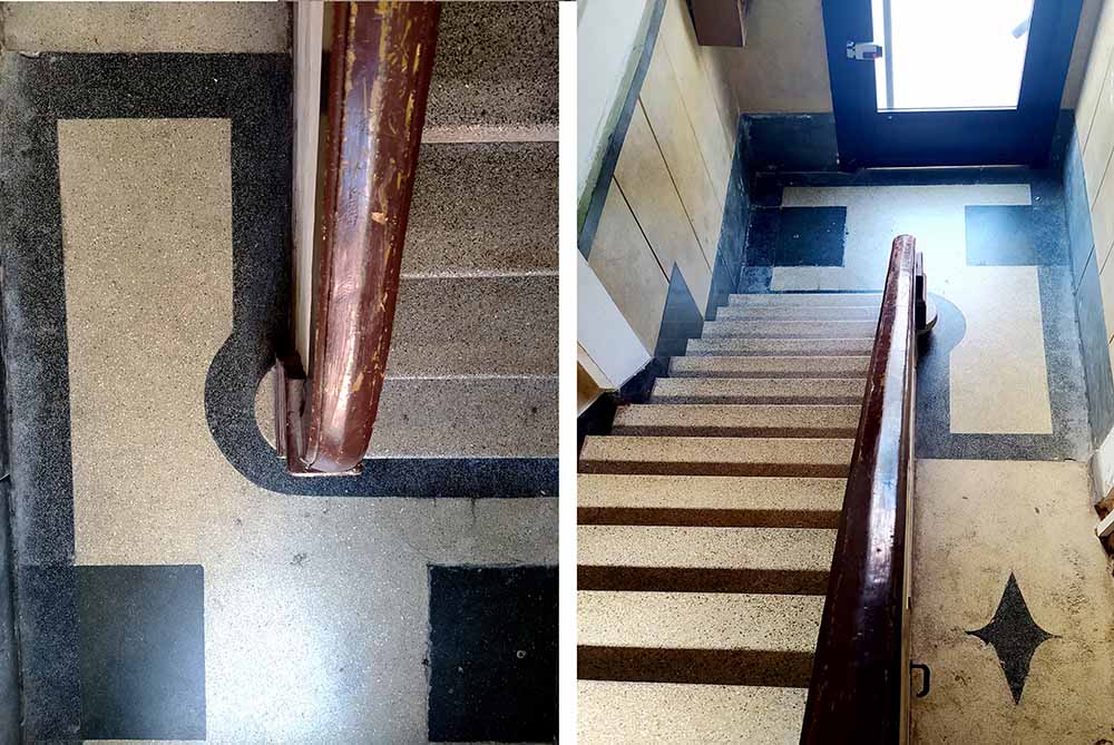En las siguientes fotografías se muestran algunos de los portales de Os Mallos. A pesar de que son edificios que pertenecen a la década de los 50, presentan ciertos dibujos geométricos en el pavimento del terrazo de sus portales que son característicos del Art Decó, así como elementos de decorativos en escayolas y acabados.