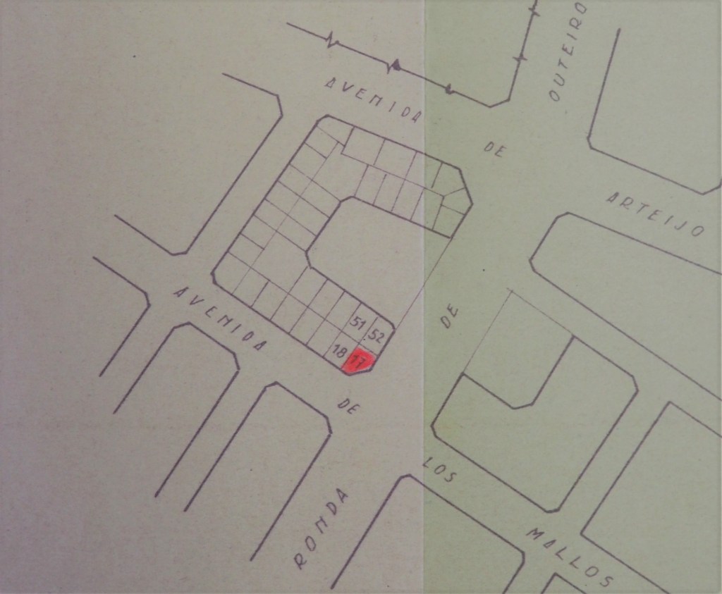 La construcción, comenzaría en 1955, por el primer edificio que se sitúa actualmente en el número 145 de la Ronda de Outeiro, conocido como Edificio Pedreira, haciendo esquina en chaflán, con un mirador en el edificio que ocupará la mitad de su frente con un vuelo de casi un metro sobre la línea de fachada, mejorando más si cabe sus cualidades espaciales interiores. El edificio alberga cuatro plantas con una única vivienda por planta de dimensiones generosas, disponiendo a partir del segundo nivel de diez ventanas a fachada; una suerte de espacio hoy en día.