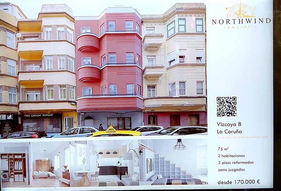 Además, hemos sacado la siguiente fotografía del escaparate de una inmobiliaria donde vemos la promoción de la rehabilitación de estas viviendas con la venta de las mismas y con un precio de salida desde 170.000 euros.