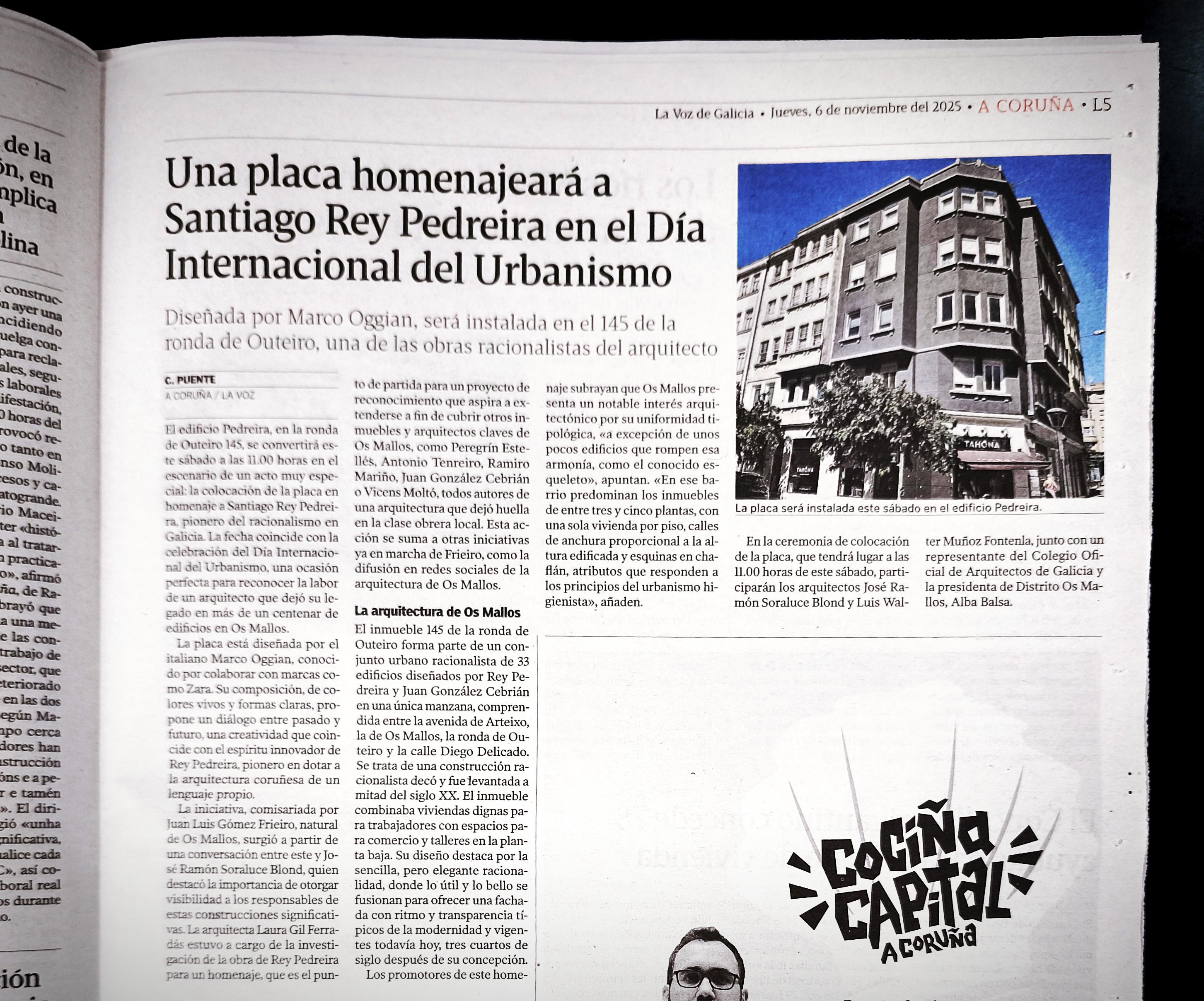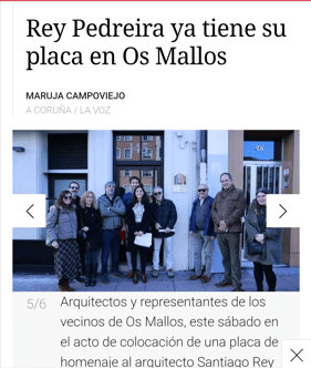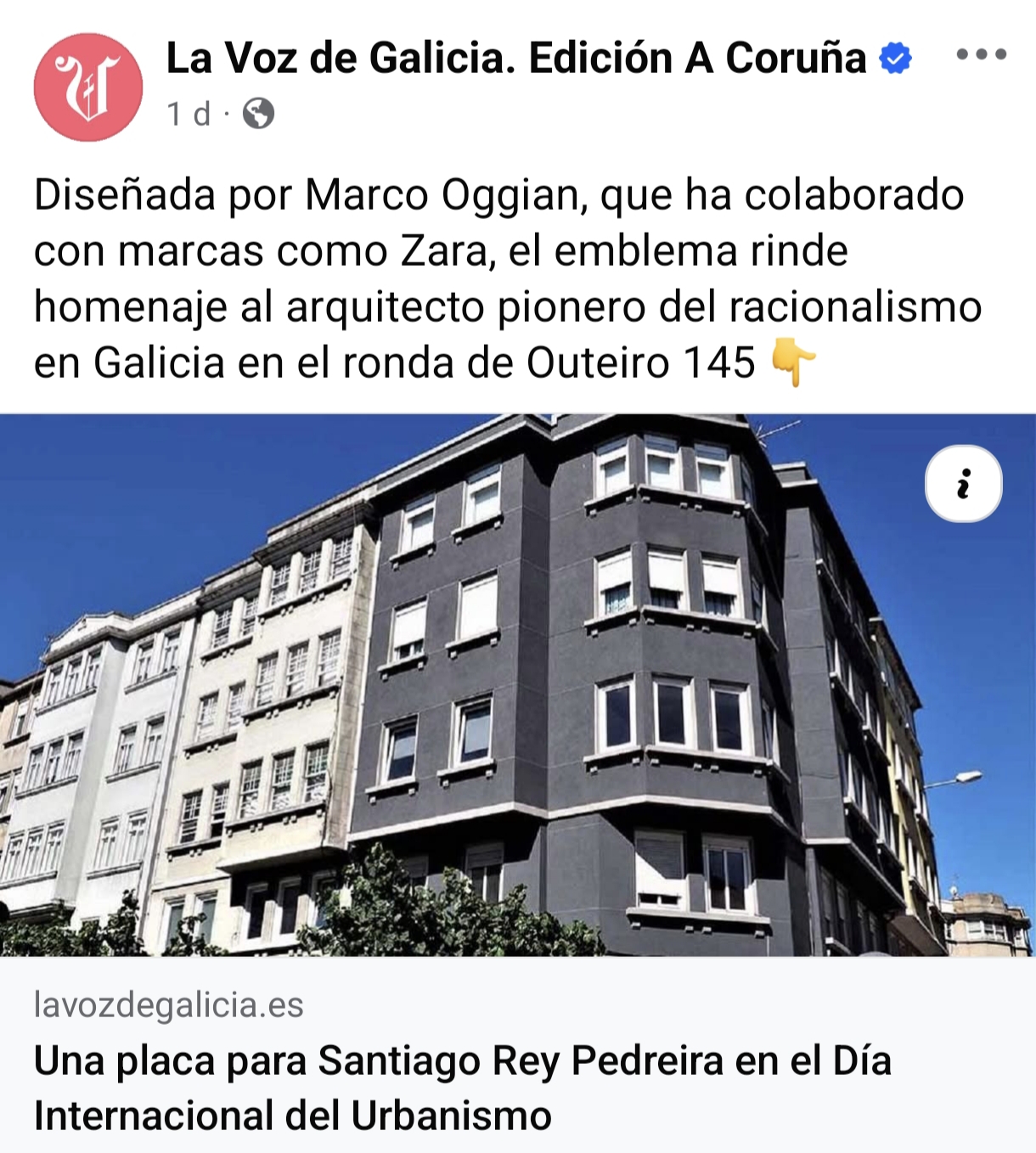 La colocación de la placa en el Edificio Pedreira, homenaje a Santiago Rey Pedreira, ha sido un acontecimiento histórico para la arquitectura coruñesa y marca un antes y un después en la visibilización del racionalismo coruñés.