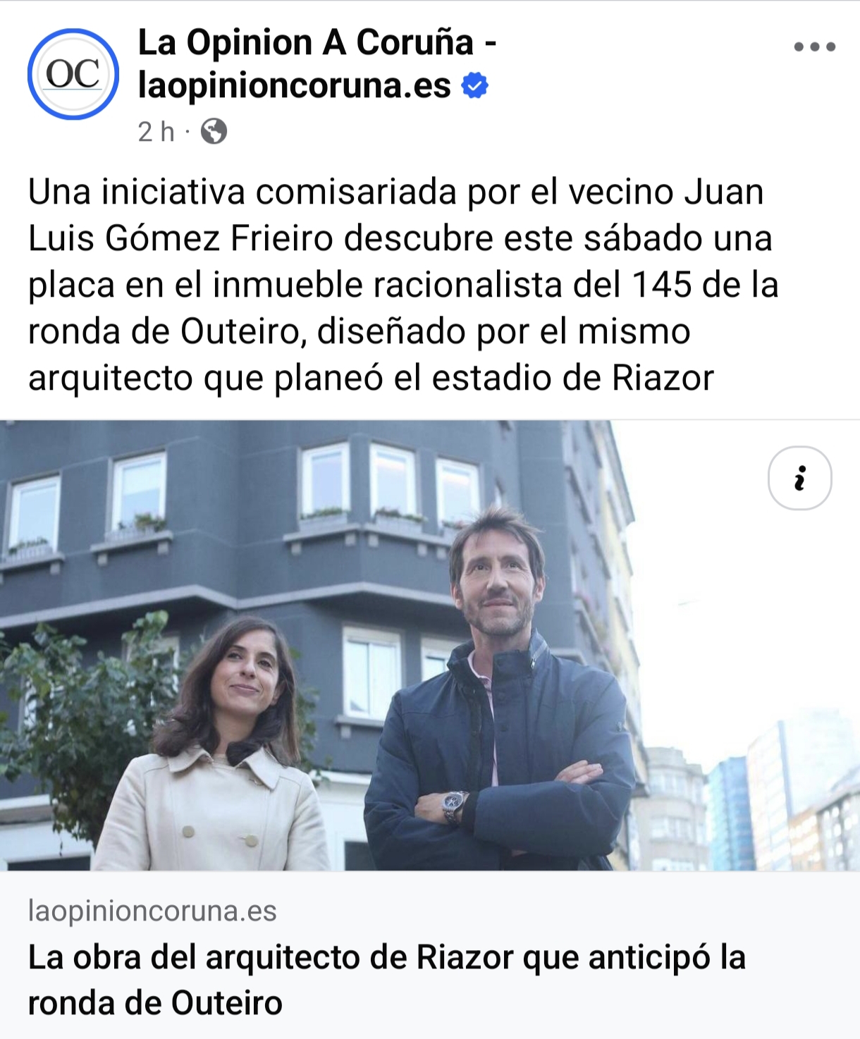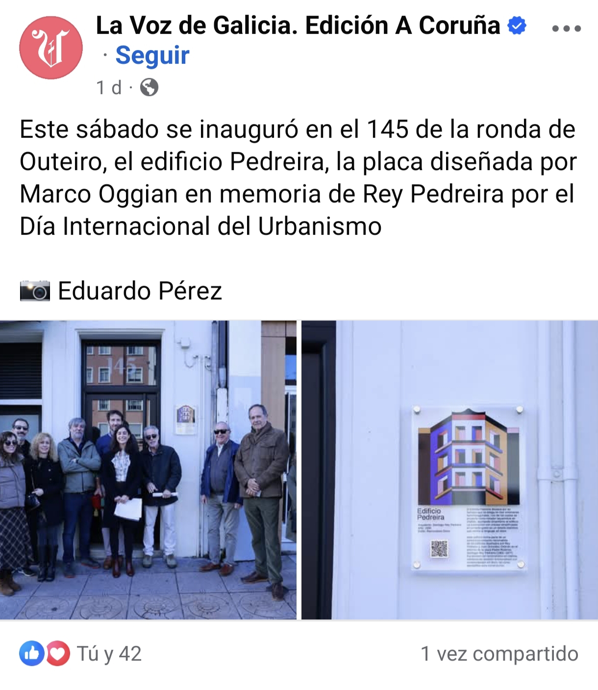 Esta placa es, en parte, un homenaje a Pedreira, pero también una invitación para que todos nosotros pensemos cómo cuidar y valorar lo que tenemos. Los edificios cuentan historias, pero también marcan el futuro del barrio y de la ciudad de A Coruña. Que el estar hoy aquí sirva para animarnos a seguir protegiendo, nombrando y explicando el patrimonio racionalista y social de esta ciudad, porque todavía queda mucho por descubrir, por contar y, sobre todo, por compartir entre quienes lo viven y disfrutan cada día.