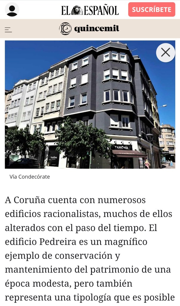 «Asimismo, deseamos expresar nuestro agradecimiento especial a Nuria Prieto, Premio Bienal de Arquitectura, quien no ha podido acompañarnos hoy por motivos profesionales, pero cuya aportación ha sido esencial. Su magnífico artículo sobre el Edificio Pedreira, publicado esta semana en el medio Quincemil de El Español, contribuye a poner en valor su historia y su significado dentro del patrimonio racionalista de la ciudad. La divulgación arquitectónica tiene, sin duda, un nombre propio: Nuria Prieto».