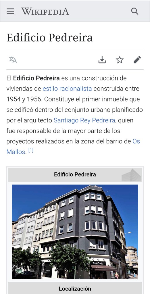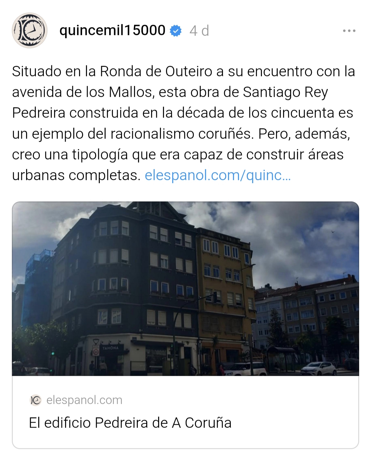 El Edificio Pedreira, que está aquí, en Ronda de Outeiro 145, fue diseñado por Santiago Rey Pedreira. Él supo responder a una época de grandes cambios y crecimiento en la ciudad. El edificio, construido a mitad del siglo XX, tenía una función muy clara: ser un lugar donde los trabajadores pudieran tener una vivienda digna, con espacio para comercios y talleres en la planta baja. Hay algo emocionante en la sencillez y funcionalidad de su diseño, donde lo útil y lo bello están unidos. La fachada tiene ese ritmo y esa transparencia que caracteriza a lo moderno, y aún hoy, tres cuartos de siglo después, sigue funcionando perfectamente.