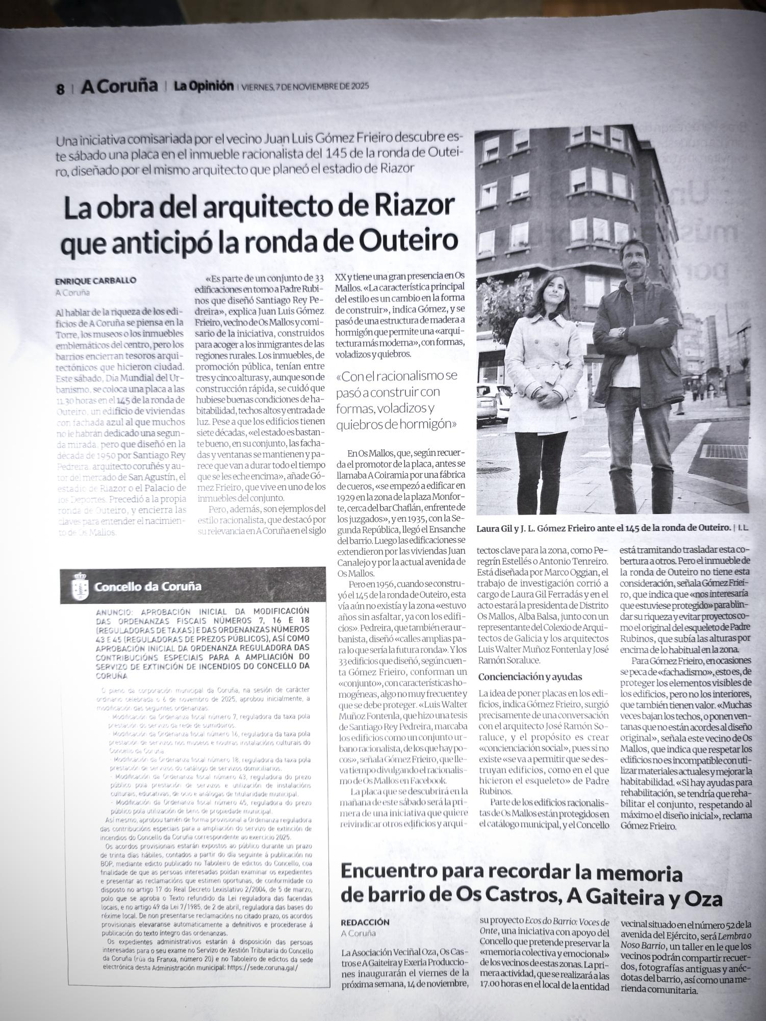No estaríamos aquí sin el entusiasmo incansable de Juan Luis Gómez Frieiro, vecino de Os Mallos, quien desde hace más de dos años impulsa la defensa de la arquitectura racionalista a través de la página “Os Mallos arquitectura racionalista”. Gracias a su mirada generosa y a su empeño por compartir el valor de este patrimonio, hoy esta iniciativa es una realidad. Comisariar esta placa ha sido para Juan Luis un acto de reivindicación y de amor al barrio; su ejemplo demuestra que la pasión ciudadana puede ser el mejor motor para la conservación y la memoria».