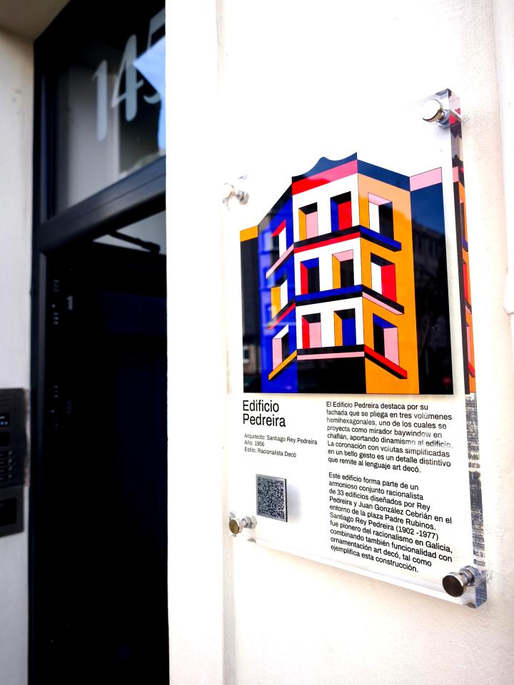 A partir de esa primera placa —diseñada con maestría por Marco Oggian, que mezcla colores vivos y formas claras para encarnar el espíritu innovador de Santiago Rey Pedreira— el proyecto se irá consolidando como un homenaje vibrante y vivo a las viviendas racionalistas, mayormente de promoción pública, pero también de aquella promoción privada que destacó por su calidad, historia u obras pioneras.